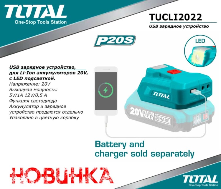 Отзывы о TUCLI2022 - ТОТАL USB зарядное устройство для Li-Ion аккумуляторов 20V с LED подсветкой - 122769038